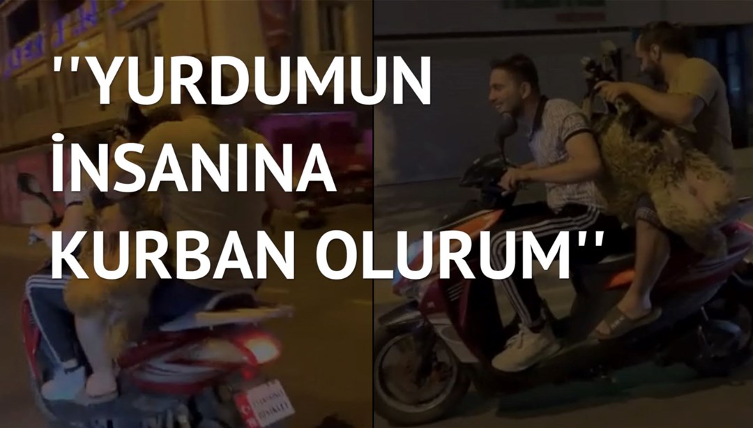 ?stanbul Sultanbeyli’de motosiklette kurbanl?k koyun ta??d?lar. Bir sürücünün cep telefonuyla kaydetti?i o anlarda, motorcunun arkas?na oturan arkada??n?n koyunu kuca??nda ta??d??? görülüyor.