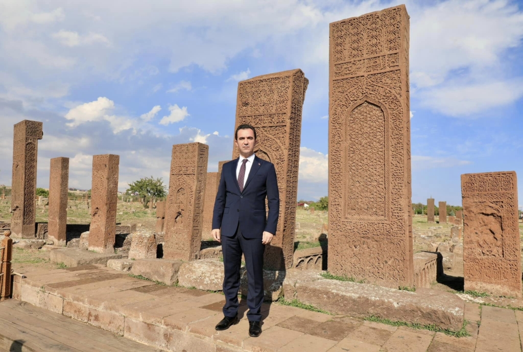 Vali Karakaya, tarihi mezar taşlarının önünde hatıra fotoğrafı çekinerek, dua ettikten sonra Ahlat ilçesinden ayrıldı.