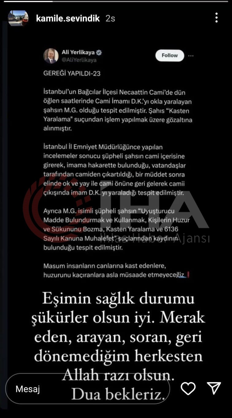 Bağcılar Necattin Camii’nde 24 Temmuz günü iddiaya göre Muhammet F.G. isimli şahıs, camide şortla namaz kılan bir kişiye müdahale etmediği gerekçesiyle imam Dursun Kuru ile önce tartıştı ardından geri gelerek cami çıkışında Kuru’yu omzundan okla yaralanmıştı. Olayın ardından imam Kuru, caminin yakınındaki Bağcılar Eğitim ve Araştırma Hastanesi’ne kaldırılırken hemen ameliyata alınmıştı. Burada ok çıkarılırken bölgeye dikişler atılmıştı. Okun isabet ettiği noktada sinirlerin şans eseri zarar görmediği öğrenilirken ameliyat da başarılı geçti. Kuru, bugün sabah saatlerinde son kontrollerin ardından taburcu edildi. Olaya ilişkin İçişleri Bakanı Ali Yerlikaya da sosyal medya hesabından paylaşımda bulunurken saldırgan Muhammet F.G., tutuklanarak cezaevine gönderildi. İmam Kuru’nun eşi Kamile Kuru ise dün sosyal medya hesabından yaptığı paylaşımda eşinin durumuna ilişkin konuştu.
