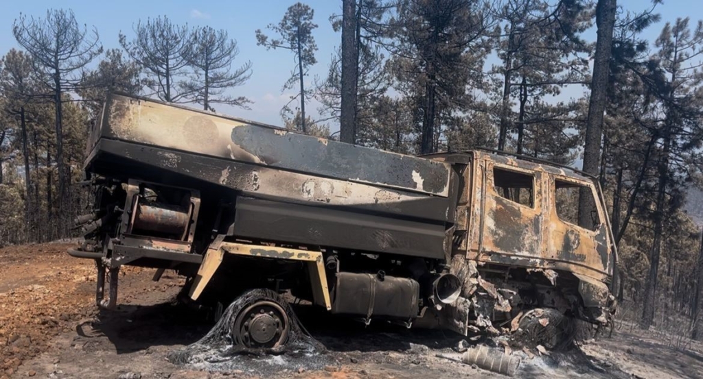 Bursa’da Harmancık ilçesinde devam eden yangın, 4 gün süren çalışmalar neticesinde kontrol altına alındı. Havadan ve karadan soğutma çalışmaları devam ederken ekipler gece gündüz demeden mesai yaptı. Orhaneli-Harmancık yolu üzeri AFAD Koordinasyon Merkezi yakınlarında meydana gelen yangında Orman Genel Müdürlüğü’ne (OGM) ait bir kamyon yangın arasında kaldı. Ekipler olay yerinden son anda kaçarak canını kurtarırken, kamyon bölgeyi saran alevler nedeniyle yanarak kullanılmaz hale geldi.