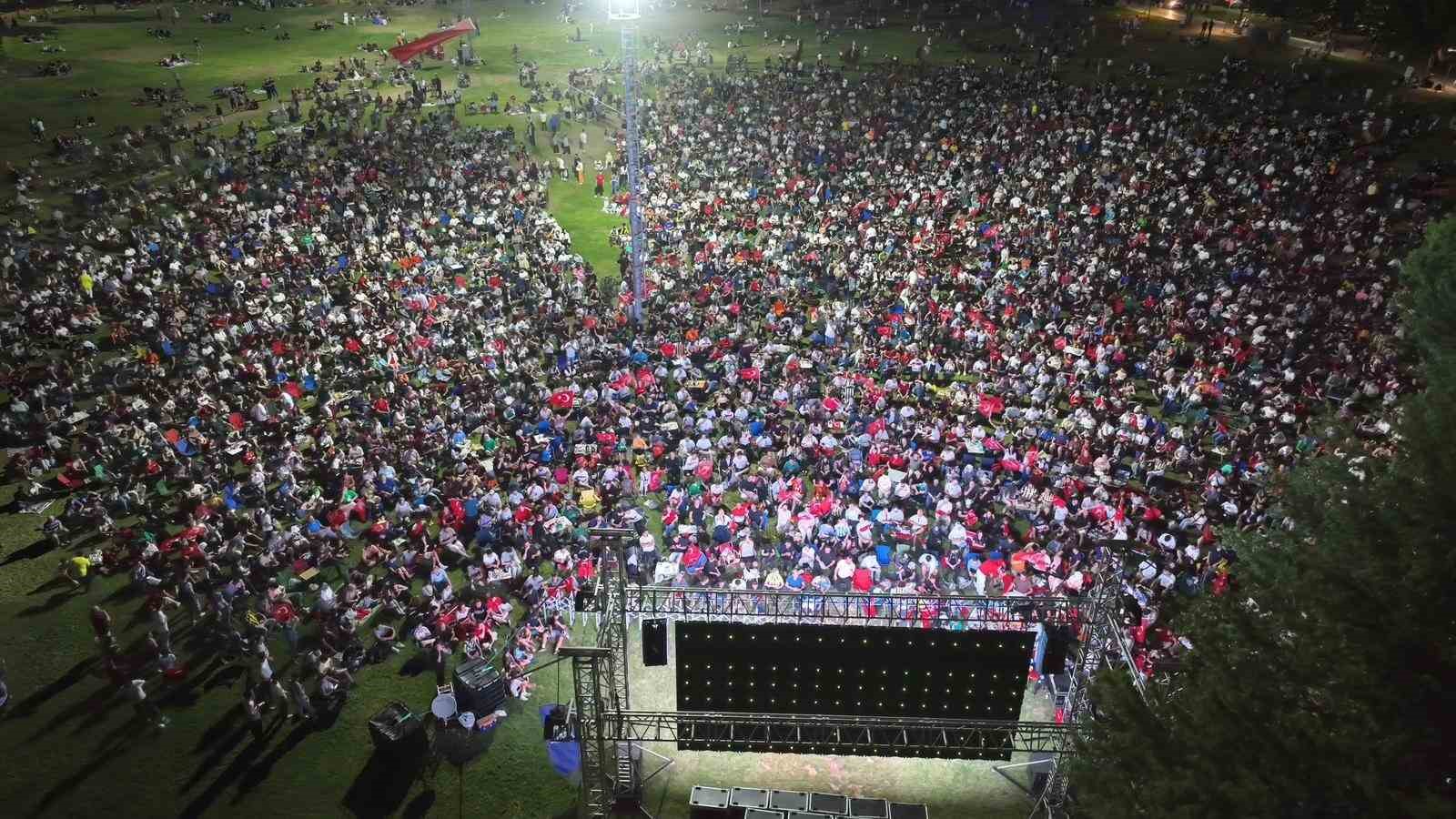 2024 Avrupa Futbol Şampiyonası’nda (EURO 2024) mücadele eden A Milli Futbol Takımı’nın Çekya maçını Bursa Büyükşehir Belediyesi’nin hazırladığı alanlarda izleyen Bursalılar, son dakikalarda gelen galibiyet golüyle büyük bir coşku yaşadı. Hüdavendigar Kent Parkı’nda ellerinde Türk Bayraklarıyla maçı dev ekranda izlemeye gelen binlerce kişi heyecana ortak oldu. Dron ile kaydedilen görüntüler de “Hamburg değil Bursa” dedirtti
