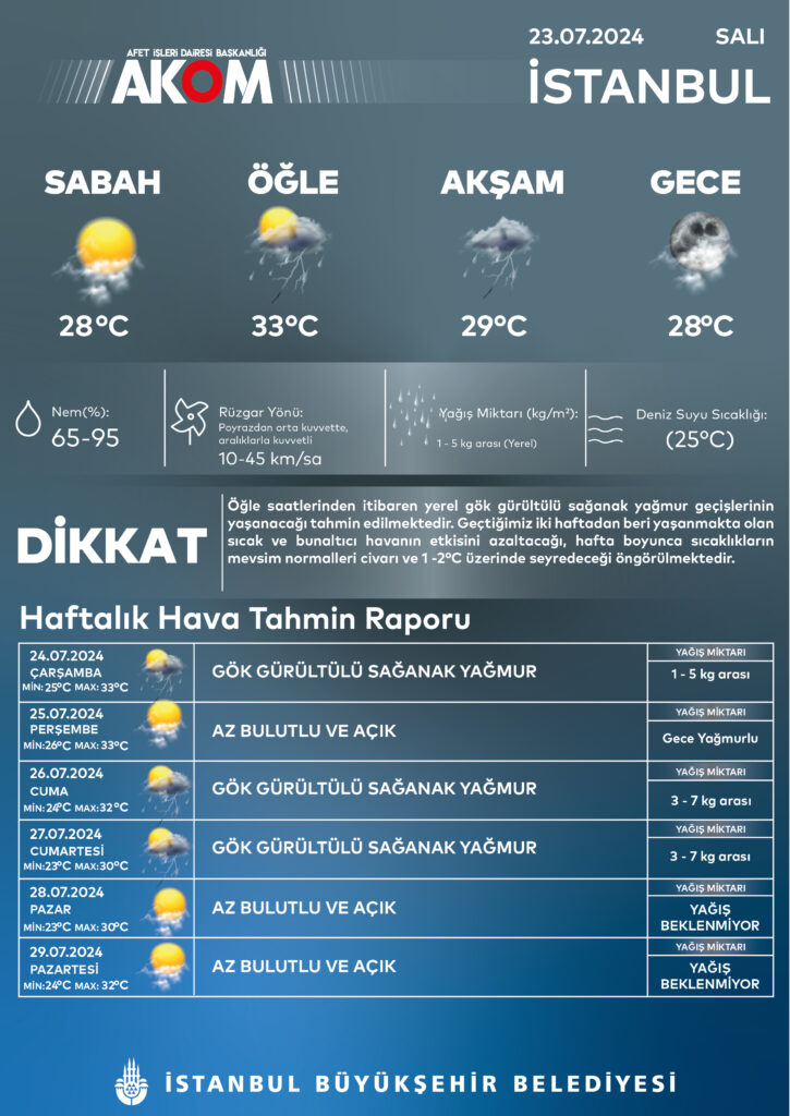 AKOM tarafından yapılan açıklamada İstanbul için bugün öğle saatlerinden itibaren gök gürültülü sağanak yağış müjdesi verildi. Yapılan açıklamada İstanbul’u yaklaşık iki haftadır etkisi altına alan sıcak ve bunaltıcı havanın etkisini azaltacağının tahmin edildiği aktarıldı.