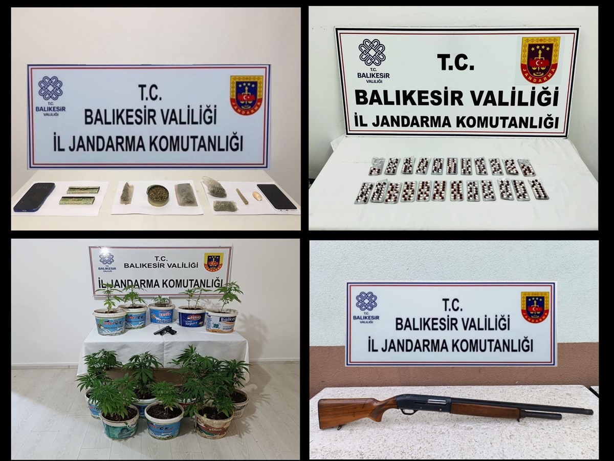 Balıkesir İl Jandarma Komutanlığı, uyuşturucu madde imal ve ticaretine yönelik yapılan istihbari çalışmalar neticesinde; Ayvalık, Karesi, Marmara ve Sındırgı ilçelerinde uyuşturucu madde imal ve ticareti suçu işlediği tespit edilen şüphelilerin yakalanması ve suç unsurlarının ele geçirilmesine yönelik 6 ikamet, bir işyeri ve bir araca geçtiğimiz gün operasyon düzenledi. Yapılan operasyonlarda; 308 sentetik uyuşturucu hap, 42 gram kubar esrar, 15 gram kokain, 23 kök kenevir bitkisi, 2 uyuşturucu kullanma aparatı, bir ruhsatsız tabanca, bir ruhsatsız av tüfeği, bir şarjör ve 2 cep telefonu ele geçirildi. Olaylara karışan 6 şüpheli yakalanarak haklarında adli işlem başlatıldı.