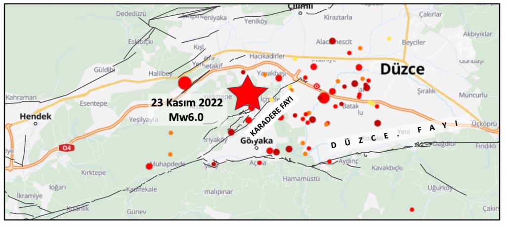 “23 Kas?m 2022 saat 04.08’te Düzce ilinin 15 km bat?s?nda 6.0 büyüklü?ünde, oldukça kuvvetli bir deprem oldu. ?lk bilgilere göre deprem Düzce ile Hendek aras?nda yer alan Gölyaka civar?ndad?r. Deprem geni? bir alanda hissedildi. Birçok insan uykusundan uyand?. Deprem merkezine yak?n binalar?n bir bölümünde hafif hasarlar var. Hasar tespitleri sürüyor. Çok say?da artç? deprem etkinli?i var. Artç? depremlerden birinin büyüklü?ü 4.5 ve artç? depremler bir süre daha hissedilecek.