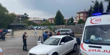 Otomobille çarpışan motosikletteki 2 kişinin yaralandığı anlar kamerada