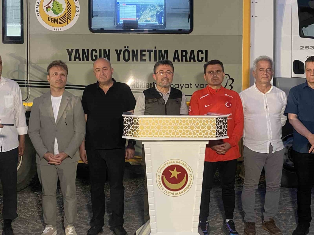 Çanakkale’ye gelen Tarım ve Orman Bakanı İbrahim Yumaklı, havadan helikopter ile bölgede yaptığı incelemenin ardından Çanakkale Savaşları Destanı Tanıtım Merkezinde konuşlu Orman Genel Müdürlüğüne ait Yangın Yönetim Aracında bilgi aldıktan sonra yangınla ilgili son durum hakkında açıklama yaptı. Açıklamada, AK Parti Çanakkale Milletvekili Ayhan Gider, CHP Çanakkale Milletvekilleri İsmet Güneşhan, Özgür Ceylan, Çanakkale Orman Bölge Müdürü Enver Demirci, Çanakkale Savaşları Gelibolu Tarihi Alan Başkanı İsmail Kaşdemir, Gelibolu Belediye Başkanı Dr. Ali Kamil Soyuak’da hazır bulundu.