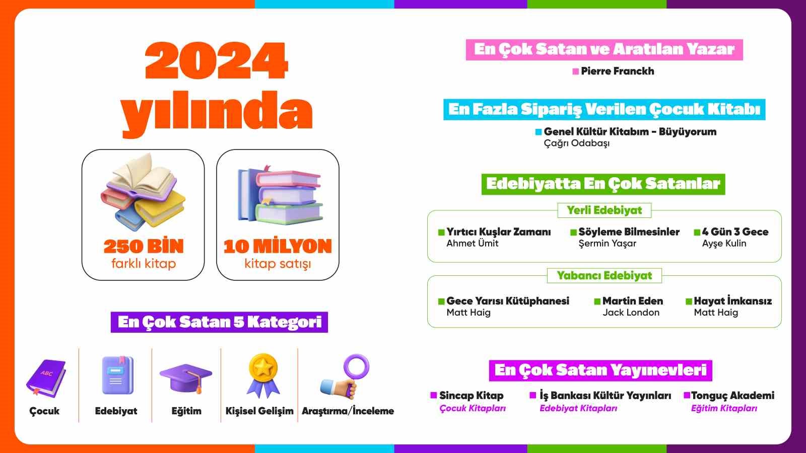 2024 yılında en çok satan yazarlar arasında birinci sırayı Pierre Franckh aldı. Franckh’in “Rezonans Kanunu” isimli kitabı 2024 yılının en çok aratılan ve en çok satın alınan kitap oldu. Bunu Ahmet Ümit’in “Yırtıcı Kuşlar Zamanı” isimli kitabı ve Matt Haig’in “Gece Yarısı Kütüphanesi” isimli kitabı takip etti. 2024 yılında en çok aranan yazar ise Şermin Yaşar oldu.