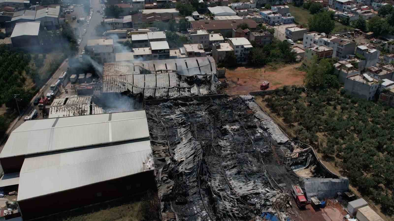 Bursa’da bir fabrikada başlayan ve kısa sürede 3 fabrikaya daha sıçrayan yangın kontrol altına alındı. Soğutma çalışmalarının sürdüğü fabrikalar havadan dron ile görüntülendi.